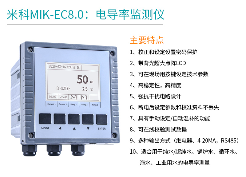 適用場合:無論是常見的自來水,鍋爐給水,純水,超純水,還是工業用水,海水,污水等,米科MIK-EC8.0電導率儀搭配不同電極,都能很好地適應現場測量