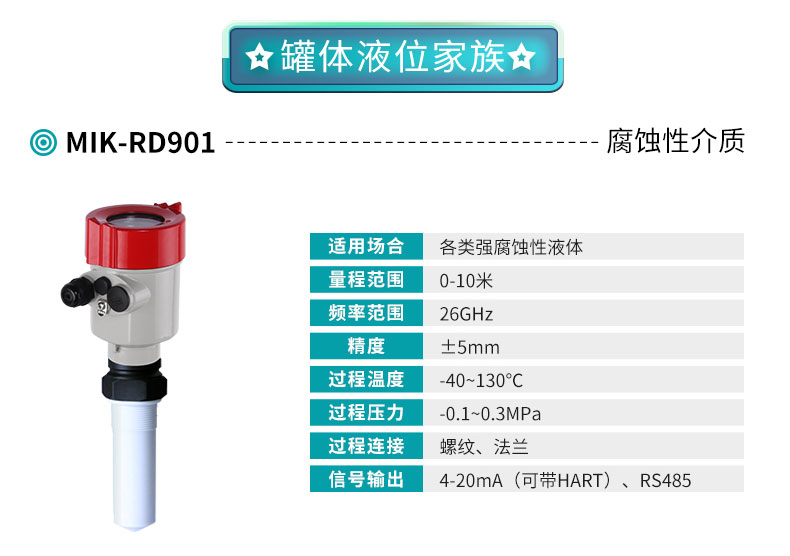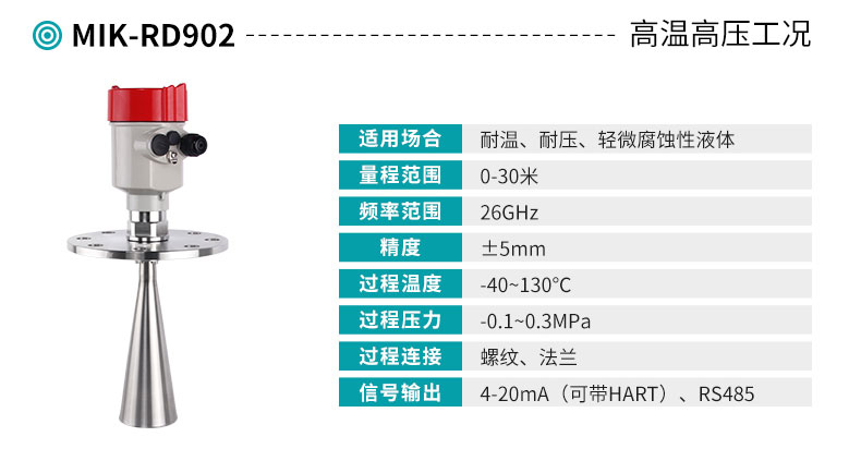 米科MIK-RD901/902高頻雷達液位計,26G高頻系列可用于需要發射角度小精度高的場合。