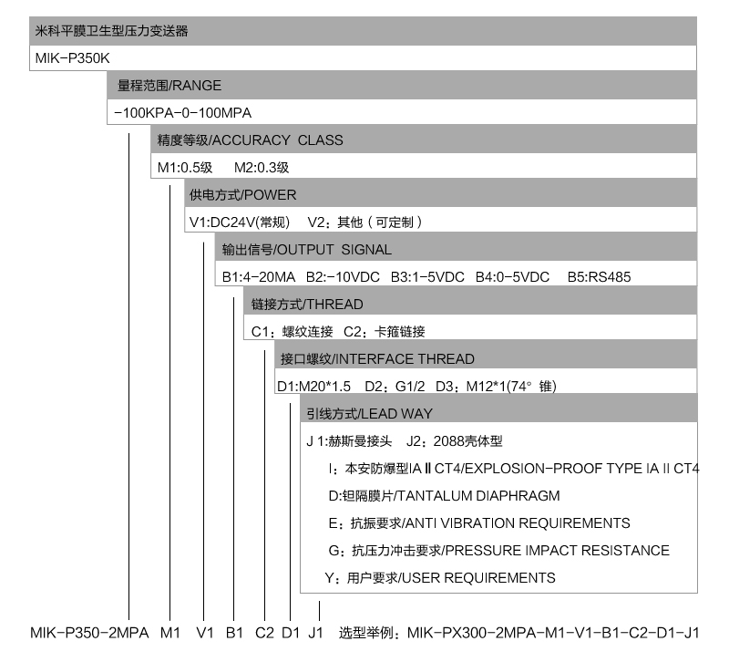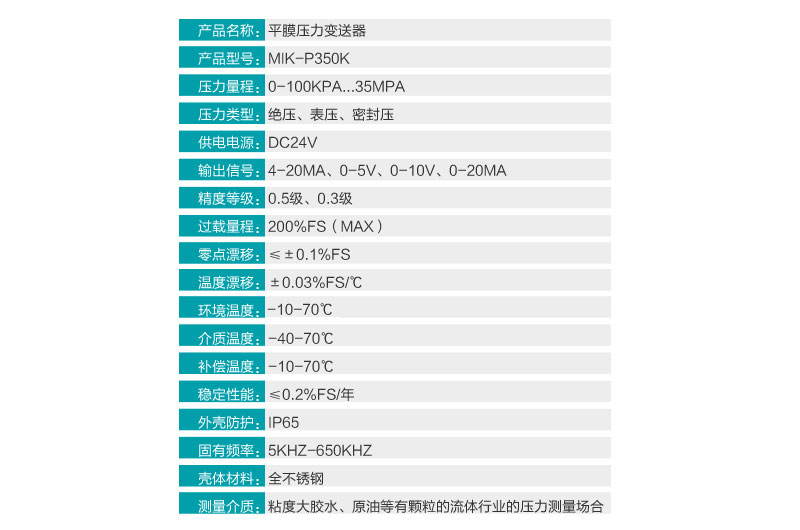 MIK-P350系列平面膜結構壓力變送器選用德國進口擴散硅芯體,采用平面膜直接感受壓力。傳感器接口有卡箍式,M27×2,法蘭式可供選擇。輸出信號有電壓、電流、頻率信號等可選擇,傳感器平膜片防止了結垢,不衛生及粘稠液體堵塞等問題。廣泛應用于食品、醫藥、衛生及釀酒工業等部門。