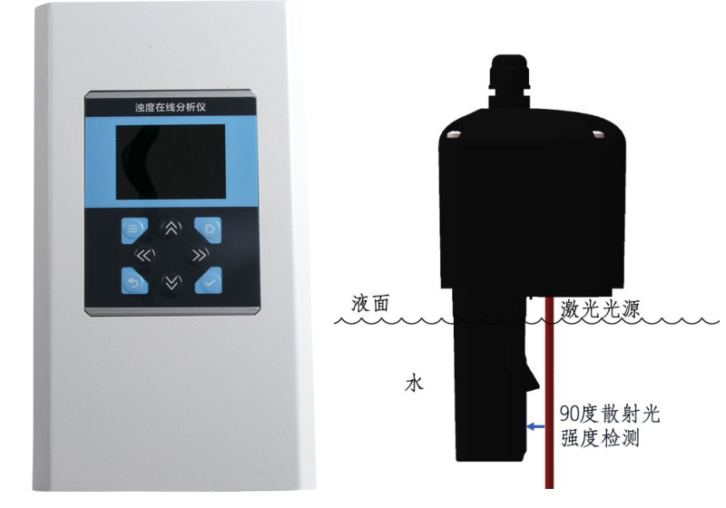 原理:濁度在線分析儀將一束激光,從空氣中,按垂直于水面的方向,射入水中。激光被水中的懸浮顆粒散射,水中的傳感器檢測出與入射光成90 度方向的散射光強度,并根據校準表,將散射光強度換成成為濁度值。
